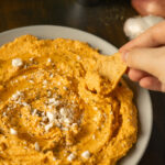 This whipped pumpkin and feta dip is a quick and easy recipe for any autumn get-together! Sweet pumpkin puree is blended with tangy feta and lots of savory additions to make a simple and stunning appetizer, side, or snack.